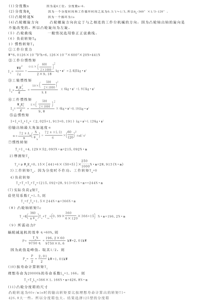 铁制工作台高度h为20mm,直径D为Ø600mm,工装和工件安装直径为Ø500mm、6工位、工装重力为50N,工作重力为5N。在工作台半径250mm位置处是滑动面。工作台支撑承受工作台重力,1个循环为1s,分度时间为0.3s。凸轮轴和输出轴的旋向如图所示,寿命为20000h。